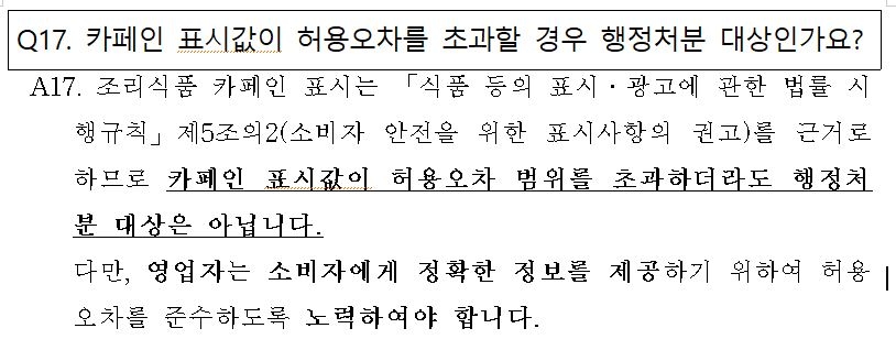 식약처는 식품안전나라 누리집을 통해 "커피전문점의 카페인 표시 값이 허용오차 범위를 초과하더라도 행정처분 대상은 아니다"고 안내한다.