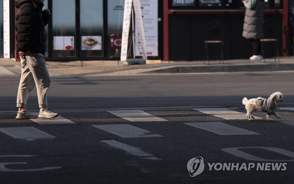 | ▲ "목줄 없이 산책하면 안 돼요" 한 횡단보도에 반려견이 목줄 없이 보호자 앞에서 걸어가고 있다.[연합뉴스 자료사진] |