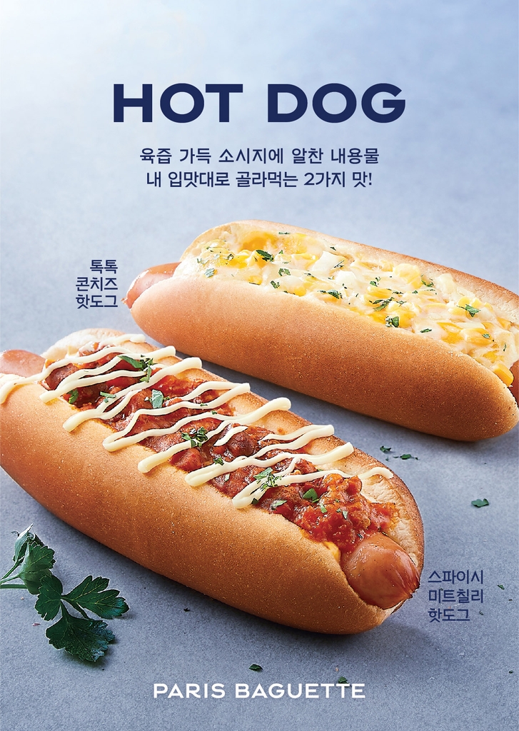 ▲ SPC그룹의 파리바게뜨는 '육즙 가득한 핫도그' 2종을 출시했다. '스파이시 미트칠리 핫도그'와 '톡톡 콘치즈 핫도그'로 간식이나 술안주로 즐기기에 좋다.