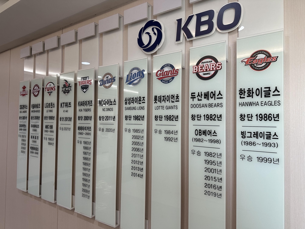 | ▲ 한국야구위원회(KBO) 사무국 벽에 붙은 구단별 우승 소개 현황 [촬영 장현구] |