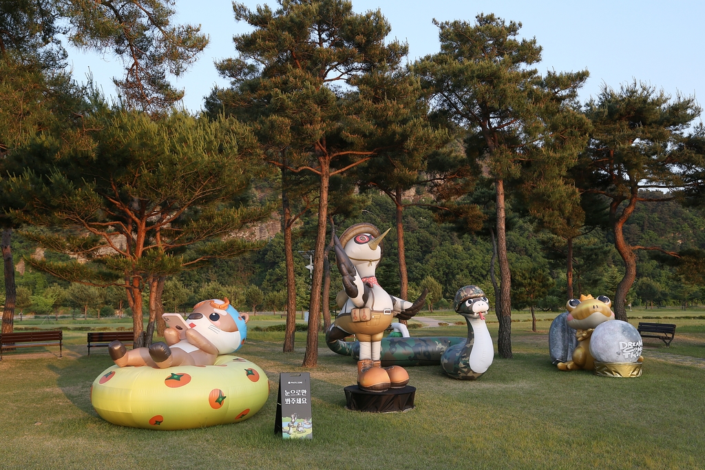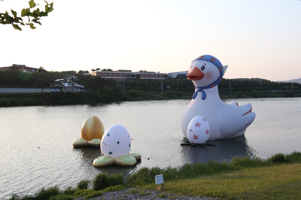 (상주=연합뉴스) 홍창진 기자 = 경북 상주시가 관광 명소인 낙동강 경천섬에 '낙동강 오리알' 등 테마 조형물을 도입해 관광객 인기를 끌고 있다.