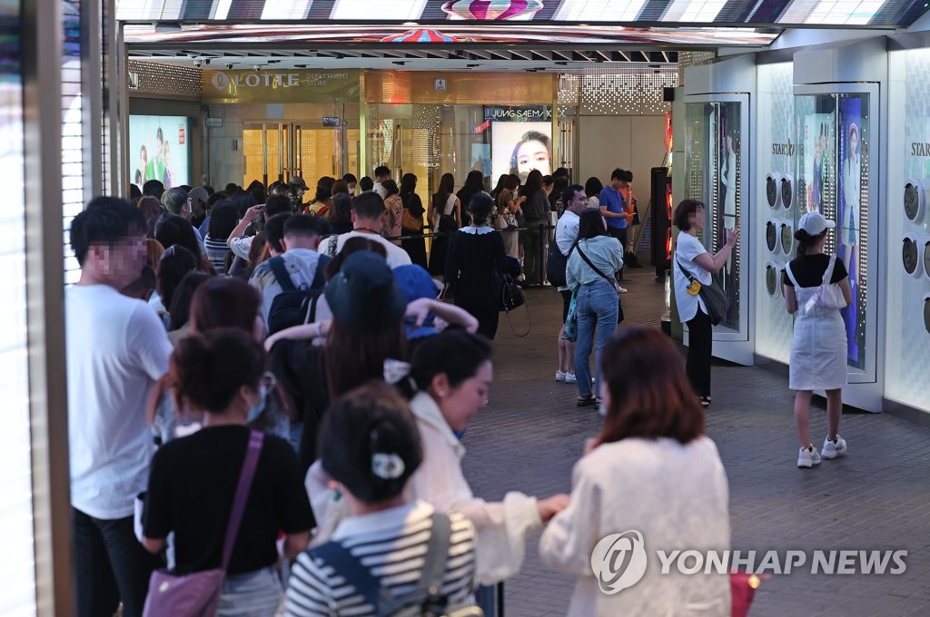 | ▲ '유커가 돌아온다' 면세업계 기대감 (서울=연합뉴스) 류영석 기자 = 중국이 자국민의 한국 단체여행을 허용하기로 함에 따라 국내 여행·호텔·면세업계의 기대감이 고조되는 가운데 11일 오전 서울 중구 롯데면세점 명동본점에서 외국인 관광객들이 입장을 위해 대기하고 있다. 2023.8.11 ondol@yna.co.kr |