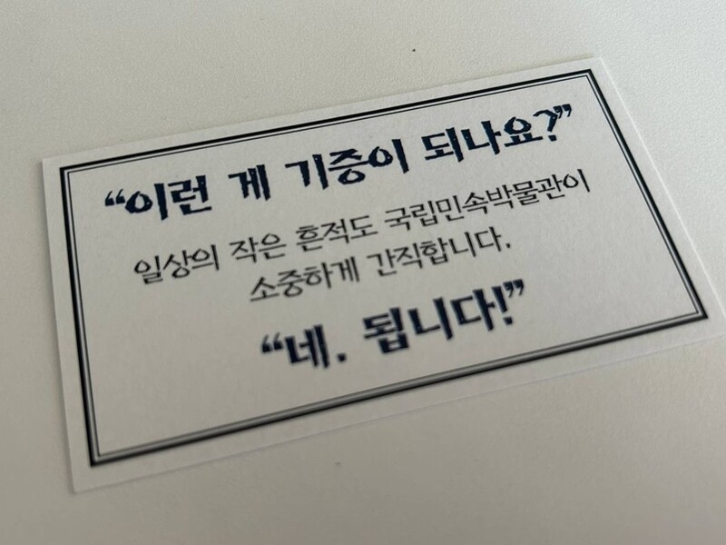 명함 뒷면에는 '이런 게 기증이 되나요?', '네, 됩니다!', '일상의 작은 흔적도 국립민속박물관이 소중하게 간직합니다'는 문구가 적혀 있다.