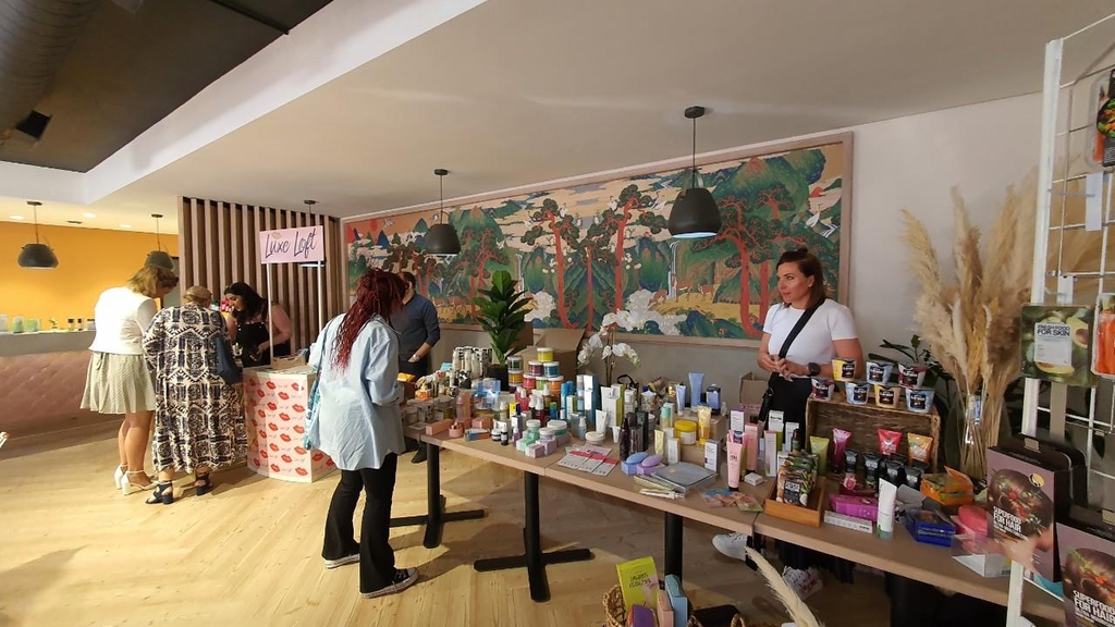 ▲ '케이뷰티 화장품도 팔아요' (프리토리아=연합뉴스) 김성진 특파원 = 27일(현지시간) 주남아공문화원에서 열린 '한류 축제 2022'에 선보인 케이뷰티 제품을 둘러보는 참가자들. 2022.8.27 sungjin@yna.co.kr
