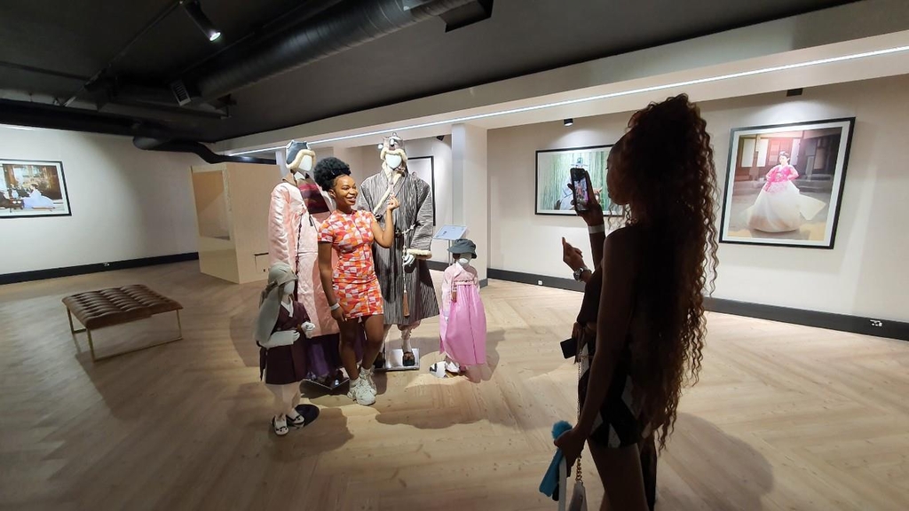 ▲ '한복' 배경으로 찰칵 (프리토리아=연합뉴스) 김성진 특파원 = 27일(현지시간) 주남아공문화원에서 열린 '한류 축제 2022' 참가자 중 일부가 한복 전시물을 배경으로 기념촬영을 하고 있다. 2022.8.27 sungjin@yna.co.kr