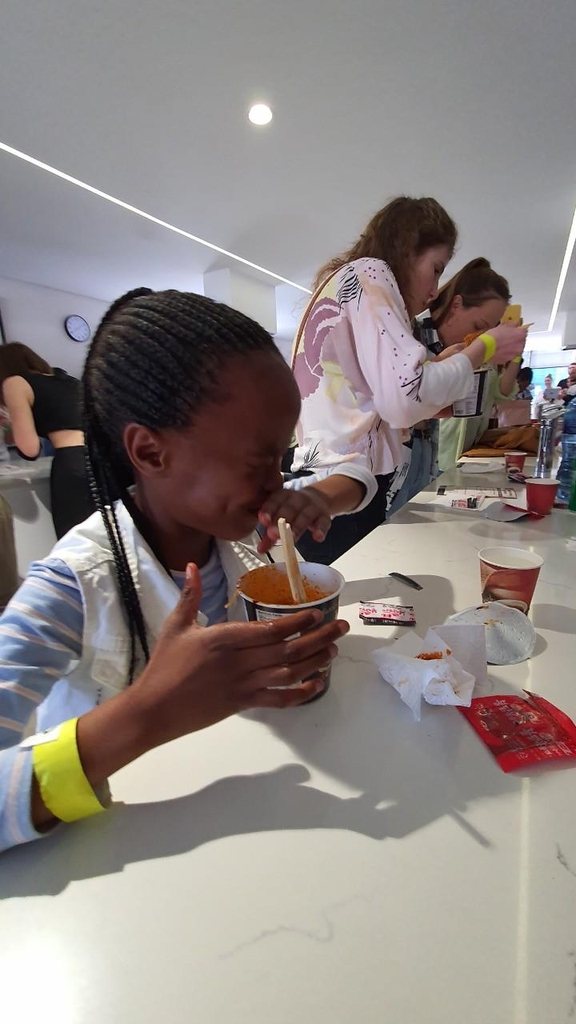 ▲ '아 매워, 찡그리면서도 계속' 불닭볶음면 챌린지 (프리토리아=연합뉴스) 김성진 특파원 = 27일(현지시간) 남아공 '한류축제 2022'에 참가한 호프(8)가 불닭볶음면 먹기 챌린지에 도전하고 있다. 호프는 물을 연거푸 마셔가면서 매운 라면을 끝까지 먹었다. 2022.8.27 sungjin@yna.co.kr
