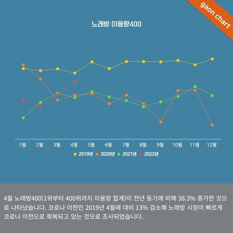 29일 가온차트에 따르면 지난달 '노래방 이용량 400'은 전년 동기 대비 38.3% 증가했다.