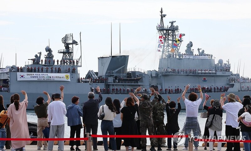 ▲ Family members of troops of the Cheonghae unit's 41st rotation wave goodbye as the 3,200-ton ROKS Yang Man-chun destroyer, carrying the contingent, departs from a key naval base in Busan, 320 kilometers southeast of Seoul, on Sept. 25, 2023. (Yonhap)