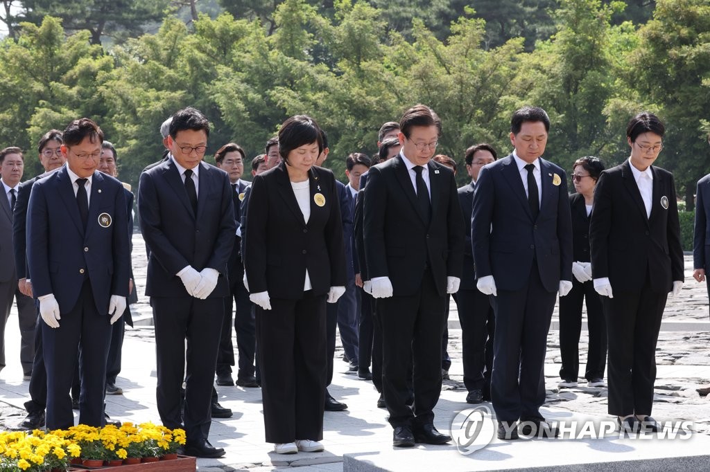 ▲ Leaders of political parties, including Kim Gi-hyeon (2nd from R) of the ruling People Power Party, Lee Jae-myung (3rd from R) of the Democratic Party and Lee Jeong-mi (4th from R) of the Justice Party, pay tribute to the late former President Roh Moo-hyun during a memorial service marking the 14th year since his death at Bongha Village in the southeastern city of Gimhae on May 23, 2023. (Pool photo) (Yonhap)