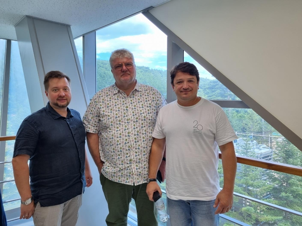 | ▲ (서울=연합뉴스) 강애란 기자 = 우크라이나 체임버 오케스트라 '키이우 비르투오지'의 상임지휘자 겸 예술감독 드미트리 야블론스키(가운데)와 첼로 부수석 유리 포고레스트스키(왼쪽), 악장 타라스 야로퍼드(오른쪽)이 지난 26일 강원도 평창군 알펜시아콘서트홀에서 연합뉴스와 인터뷰가 끝난 뒤 포즈를 취하고 있다. 2023.7.26 |