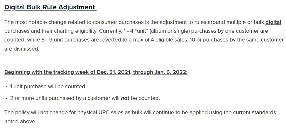 또 앨범은 3.49달러(약 4천168원), 8곡 이하가 담긴 미니음반(EP)은 0.39달러(약 466원) 미만일 때는 집계에서 제외하기로 했다. 음원을 '덤핑' 수준의 가격으로 낮게 책정해 판매량을 늘리는 시장 왜곡을 방지하기 위한 조치로 해석된다.