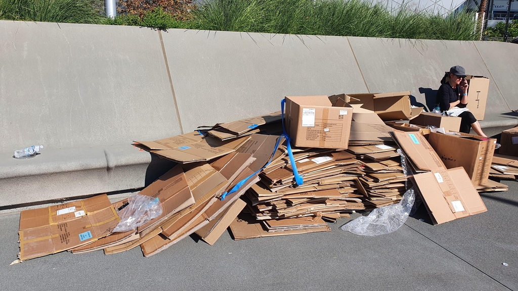 | ▲ BTS 굿즈 판매점 주변에 쌓아둔 박스 상자 (로스앤젤레스=연합뉴스) 이태수 기자 = 방탄소년단 콘서트가 열리는 소파이 스타디움 인근 BTS 굿즈 판매점에 28일(현지시간) 물건을 모두 판매한 빈 박스가 쌓여있다. 2021. 11.29. tsl@yna.co.kr |