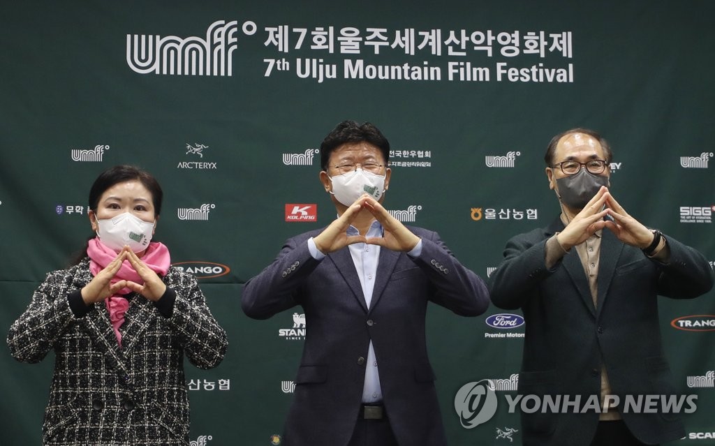 ▲ 개막 앞둔 제7회 울주세계산악영화제 (울산=연합뉴스) 김용태 기자 = 23일 오전 울산시청 프레스센터에서 열린 제7회 울주세계산악영화제 개최 기자회견에서 영화제 이사장인 이선호 울주군수(가운데), 배창호 집행위원장(오른쪽 첫 번째), 이정진 프로그래머가 기념 촬영하고 있다. 2022.3.23 yongtae@yna.co.kr