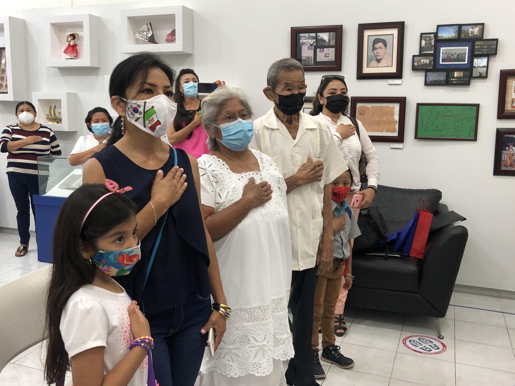| ▲ 애국가에 맞춰 가슴에 손을 올린 멕시코 한인 후손들 (메리다=연합뉴스) 고미혜 특파원 = 멕시코에서 활동한 독립운동가 김동순 선생의 후손들이 지난 3월 메리다 한인이민박물관에서 열린 건국포장 전수식에서 애국가에 맞춰 가슴에 손을 올리고 있다. 2021.4.3. |
