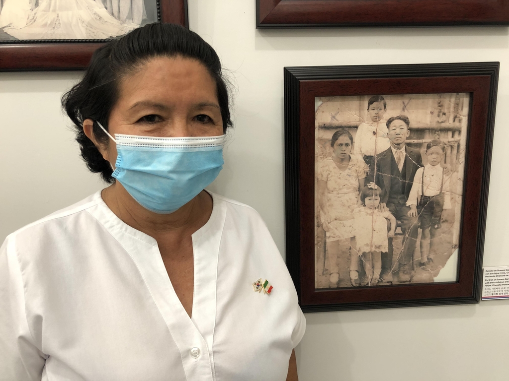 | ▲ 멕시코 메리다 한인이민박물관의 돌로레스 가르시아 관장 (메리다=연합뉴스) 고미혜 특파원 = 멕시코 유카탄주 메리다에 있는 한인이민박물관의 돌로레스 가르시아(한인 3세) 관장이 박물관에 걸린 할아버지 가족사진 옆에 섰다. 2021.4.4. |