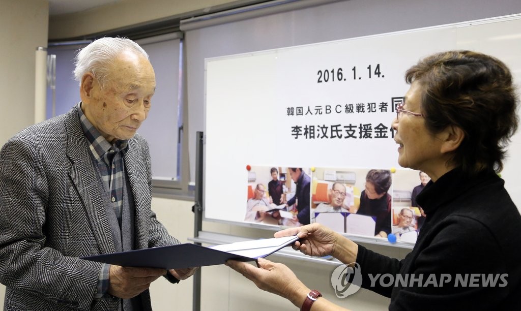| ▲ (도쿄=연합뉴스) 이세원 특파원 = 한반도 출신으로 일제 강점기에 징집됐다가 BC급 전범이 된 이들의 모임인 2016년 1월 14일 동진회(同進會) 회장 이학래 씨가 일본 도쿄의 한 학술 시설에서 '동진회를 응원하는 모임' 대표인 우쓰미 아이코(內海愛子) 일본 오사카경제법과대학 아시아태평양연구센터 소장으로부터 독립유공자 이상문 씨가 한국에서 보낸 메시지를 받고 있다. [연합뉴스 자료사진] |