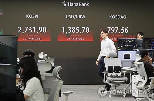 | ▲ A digital sign at a Hana Bank dealing room in Seoul shows the benchmark Korea Composite Stock Price Index added 21.25 points, or 0.78 percent, to close at 2,731.90 on July 26, 2024, snapping a two-day losing streak. (Yonhap) |