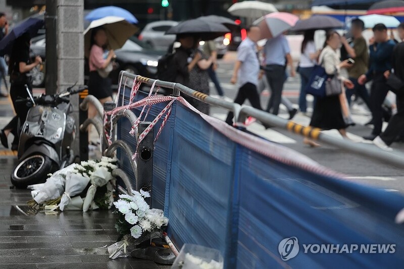 | ▲ In this photo taken on July 2, 2024, flowers are laid at the site of the crash that left nine pedestrians killed near Seoul City Hall earlier this month. (Yonhap) |