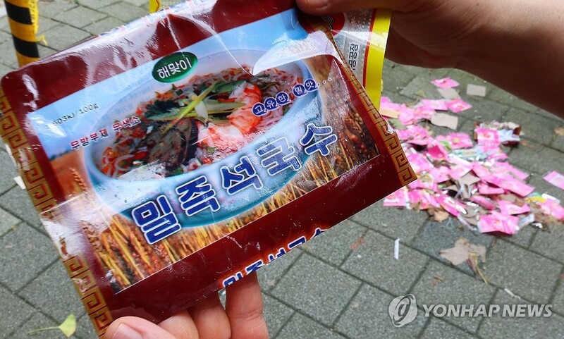 | ▲ A noodle package is seen alongside other contents of North Korea-sent trash-carrying balloons that landed in Incheon, west of Seoul, on July 24, 2024. (Yonhap) |
