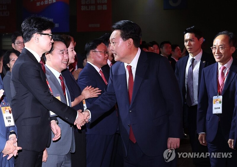 President Yoon Suk Yeol showed up at the national convention held at the KINTEX exhibition center in Goyang, northwest of Seoul, for the second consecutive year. Last year marked the first time in seven years that the president had attended a national convention of the ruling party since former President Park Geun-hye did so in 2016.