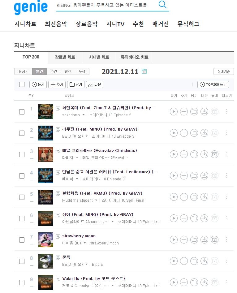 13일 지니뮤직에 따르면 '쇼미더머니 10'의 주요 경연곡들은 방송이 시작된 지 한 달 정도 지난 11월 6일부터 이달 11일까지 36일간 지니 일간 차트 1위를 차지했다.