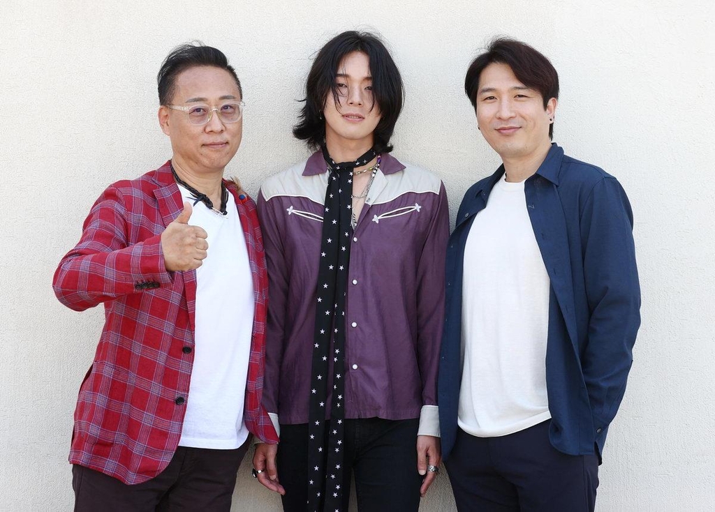 | ▲ 우리는 '공중전화' (서울=연합뉴스) 이재희 기자 = 밴드 공중전화 멤버들이 지난 21일 서울 강남구의 한 스튜디오 건물에서 연합뉴스와 인터뷰를 하기 전 포즈를 취하고 있다. 왼쪽부터 보컬 이대희. 리더 송현호, 신곡 '댄스 투나잇'(Dance Tonight)에 참여한 일본인 보컬 바이비(Bybe·본명 후쿠이 마사시), 2022.6.21 scape@yna.co.kr |