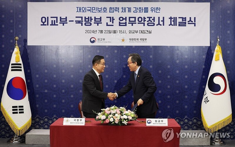 SEOUL, July 22 (Yonhap) -- The foreign ministry and the defense ministry signed a memorandum of understanding (MOU) Monday to enhance the safety and protection of overseas Koreans, officials said.
