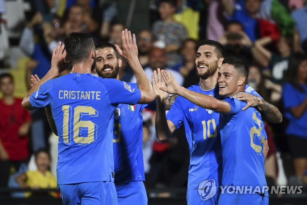 | ▲ 펠레그리니 득점 후 기뻐하는 이탈리아 선수들 [LaPresse via AP=연합뉴스] |