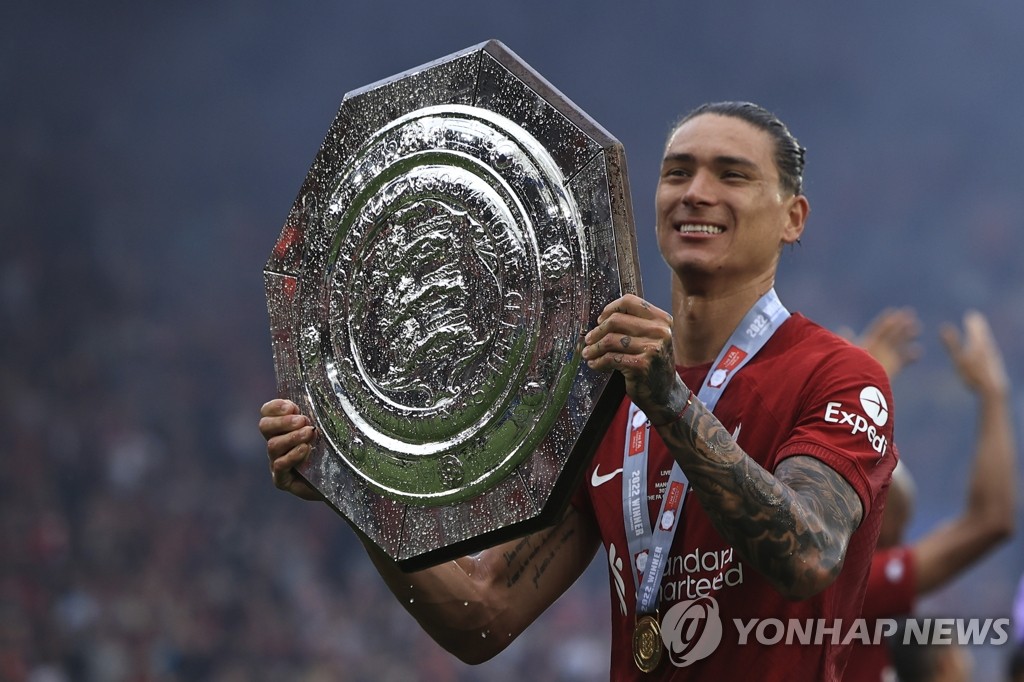 ▲ 리버풀 이적 후 첫 트로피 들어 올린 다윈 누녜스 (레스터 AP=연합뉴스) 잉글랜드 프로축구 프리미어리그(EPL) 리버풀의 다윈 누녜스(우루과이·23)가 지난달 30일(현지시간) 영국 레스터의 킹파워 스타디움에서 열린 맨체스터 시티(맨시티)와 2022 FA 커뮤니티 실드에서 승리한 뒤 트로피를 들고 기뻐하고 있다. 이번 시즌 개막을 앞두고 SL 벤피카(포르투갈)를 떠나 리버풀에 합류한 누녜스는 이날 경기 후반 추가시간에 헤딩 득점을 성공, 팀의 3-1 승리에 기여했다. 2022.7.31 alo95@yna.co.kr