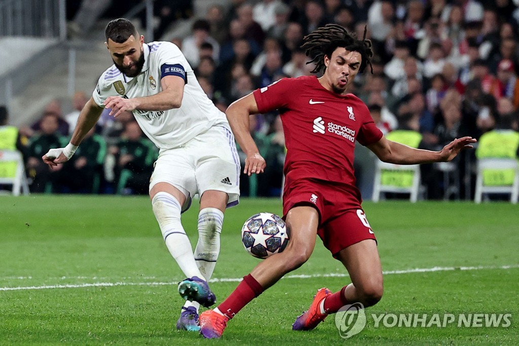 ▲ 볼 다투는 레알 마드리드의 카림 벤제마와 리버풀의 트렌트 알렉산더-아널드 [AFP=연합뉴스]