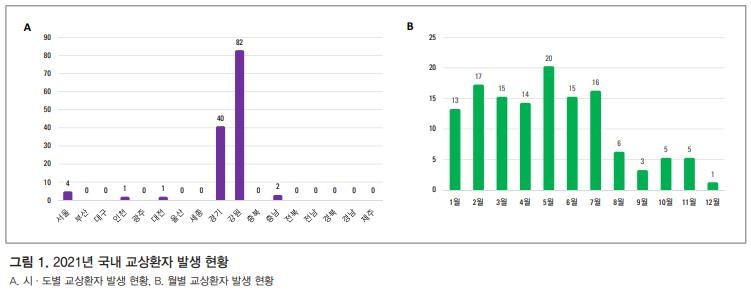작년 신고 접수된 교상 환자는 강원도(63.1%)와 경기도(30.8%)에서 많이 발생했다. 1년중 5월이 15.3%로 가장 많았고 12월이 1%로 가장 적었다.