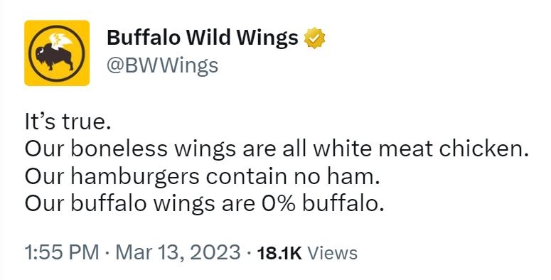 ▲ 美 유명 치킨윙 체인 '뼈 없는 닭 날개'에 대한 입장 [버팔로 와일드 윙스 트위터 화면 캡처. 재판매 및 DB 금지]