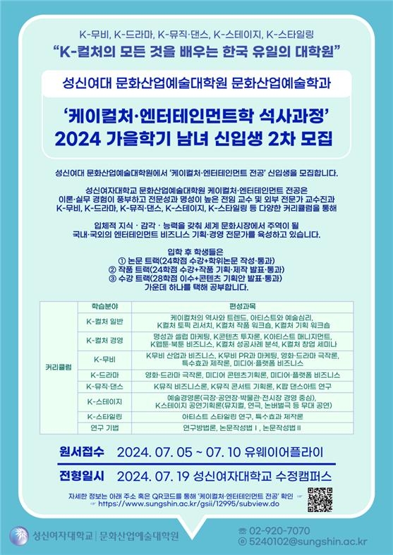 (서울=연합뉴스) 성도현 기자 = 성신여대 문화산업예술대학원(원장 김경희)은 '케이컬처·엔터테인먼트 전공' 석사 과정 가을학기 신입생 2차 모집을 진행한다고 3일 밝혔다.