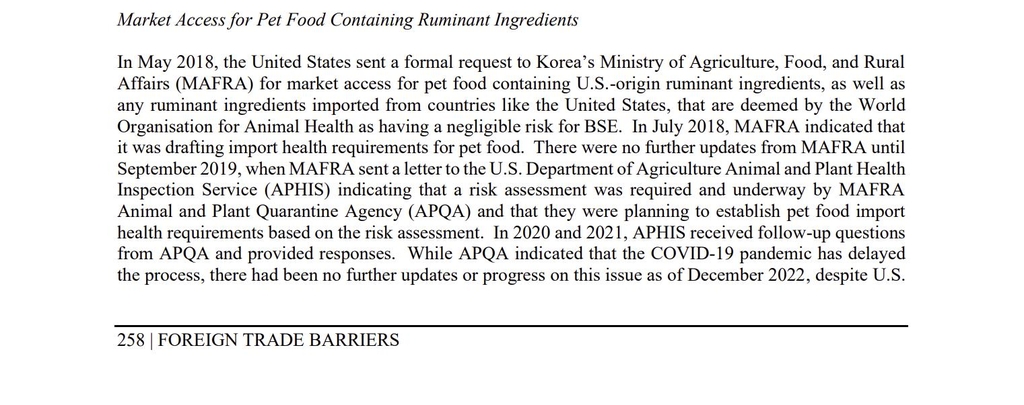| ▲ 미국무역대표부(USTR)의 2023 국가별 무역장벽보고서 (워싱턴=연합뉴스) 김동현 특파원 = 미국무역대표부(USTR)는 최근 발간한 2023 국가별 무역장벽보고서에서 한국이 반추동물을 원료로 만든 반려동물 사료 수입을 금지한 것을 무역장벽으로 지목했다. 2023.4.3 [USTR 보고서 캡처. 재판매 및 DB 금지] photo@yna.co.kr |