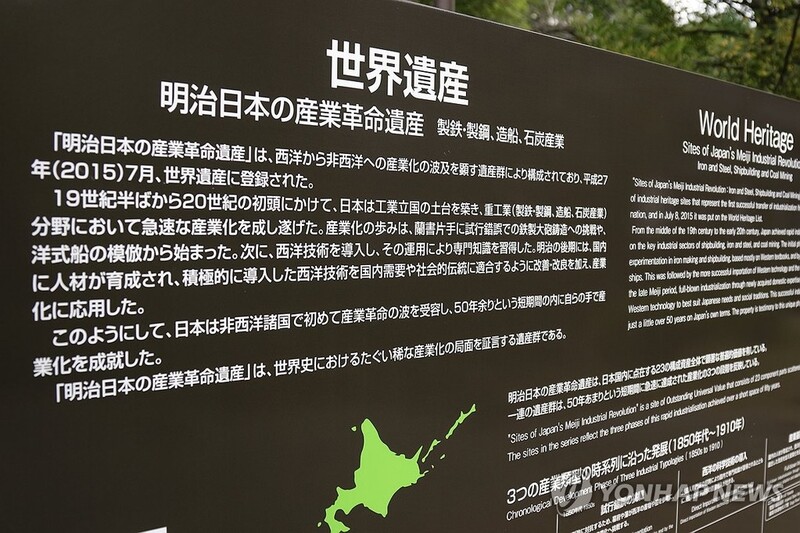 일본은 2015년 '메이지 일본의 산업혁명유산'을 세계유산으로 등재할 때 "1940년대에 일부 시설에서 수많은 한국인과 다른 나라 사람들이 본인 의사에 반해 동원되고 가혹한 조건에서 강제노역을 당했다"며 "일본 정부는 정보센터 설립 등 피해자들을 기리기 위한 적절한 조치를 포함할 준비가 돼 있다"고 밝혔다.