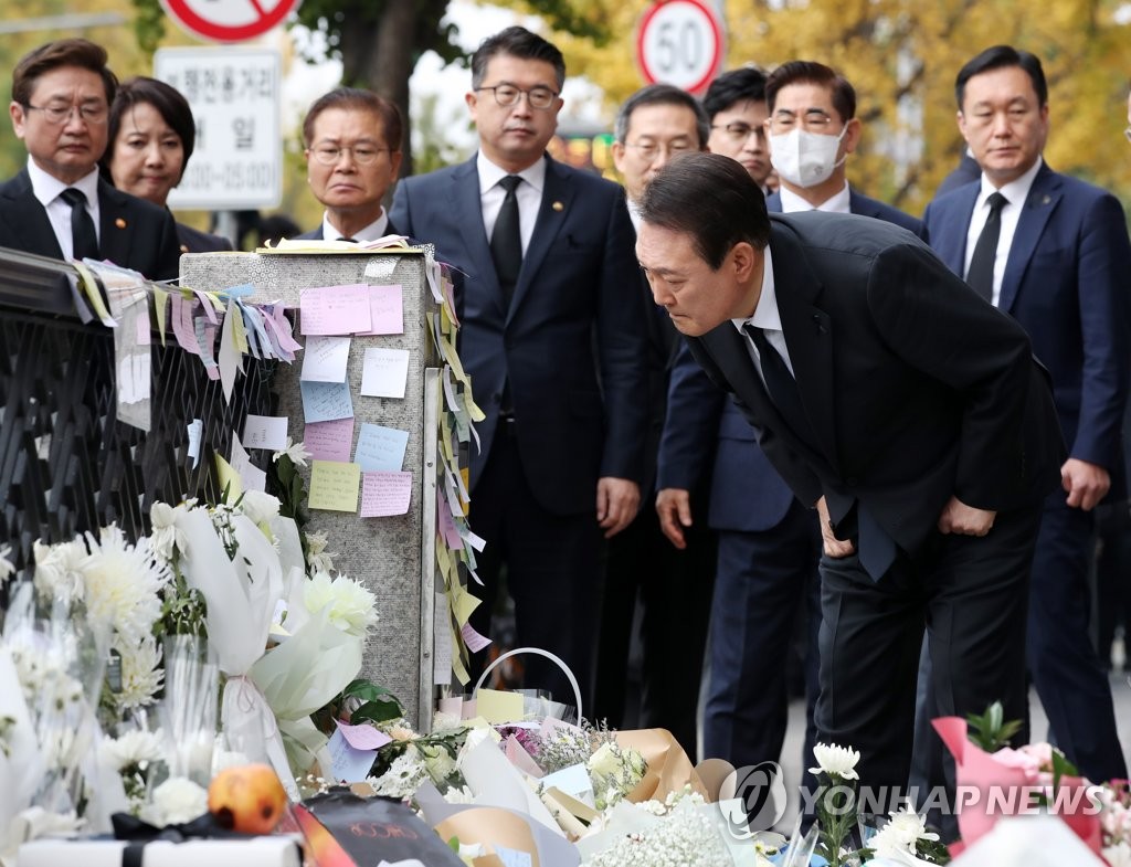 | ▲ President Yoon Suk-yeol (R) reads memorial messages during a visit to a temporary mourning space near a downhill alley in Seoul's Itaewon district on Nov. 1, 2022, the site of a crowd crush on Oct. 29 that left 158 people, mostly in their 20s, dead during Halloween festivities. (Pool photo) (Yonhap) |