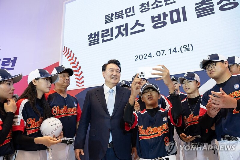 Later in the day, Yoon also attended a ceremony to encourage "Challengers," the first youth baseball team made up of North Korean defectors in South Korea, which is set to visit the United States this week for friendly events.