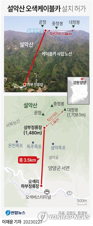 | ▲ [그래픽] 설악산 오색케이블카 설치 허가 (서울=연합뉴스) 이재윤 기자 = 환경부 원주지방환경청은 강원 양양군의 설악산국립공원 오색케이블카(삭도) 설치사업 환경영향평가에 대해 '조건부 협의'(조건부 동의) 의견을 제시했다고 27일 밝혔다.