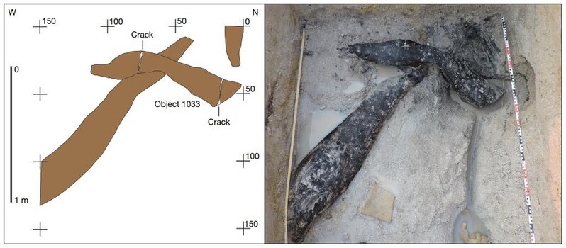 위쪽 통나무는 둥글게 홈이 파여 있고, 아래위 통나무 모두에서 도구 사용으로 생긴 자국들이 발견됐다.