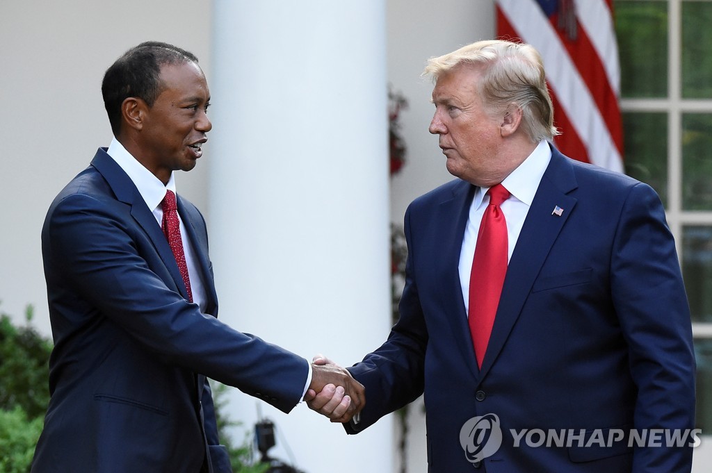 | ▲ 2019년 5월 자유의 메달 수여식 당시의 우즈(왼쪽)와 트럼프 전 미국 대통령. [로이터=연합뉴스] |