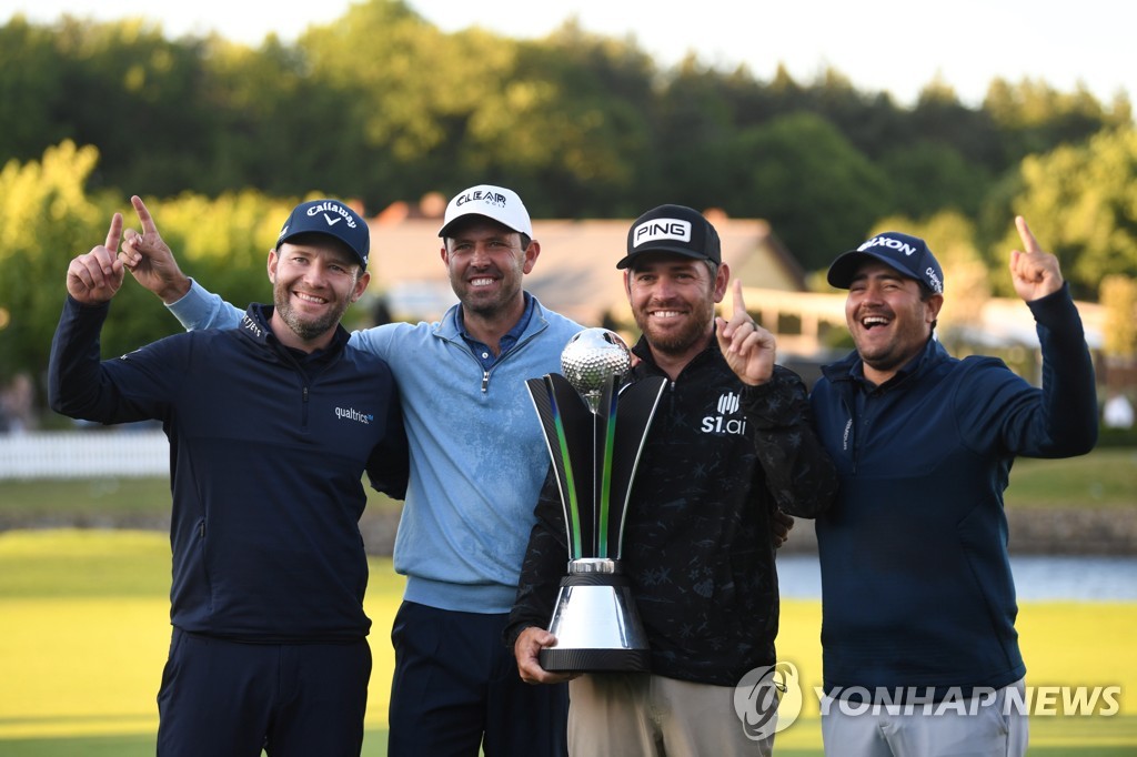 | ▲ 단체전 우승자들. 왼쪽부터 두 플레시, 슈워츨, 루이 우스트히즌, 브랜던 그레이스. [EPA=연합뉴스] |