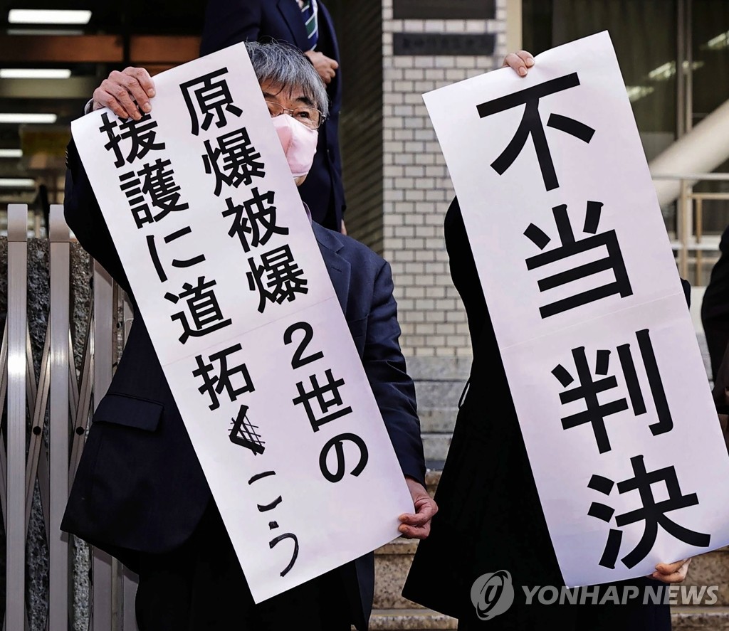 ▲ 원폭 피해자 지원 촉구하는 일본 시민단체 (나가사키 AP=연합뉴스) 12일 일본 나가사키 지방법원에서 원자폭탄 피해자 후손들이 국가를 상대로 낸 소송에서 패하자 원고측 시민단체 관계자들이 피해자에 대한 정부 지원을 촉구하는 팻말을 들고 있다. 2022.12.12 alo95@yna.co.kr