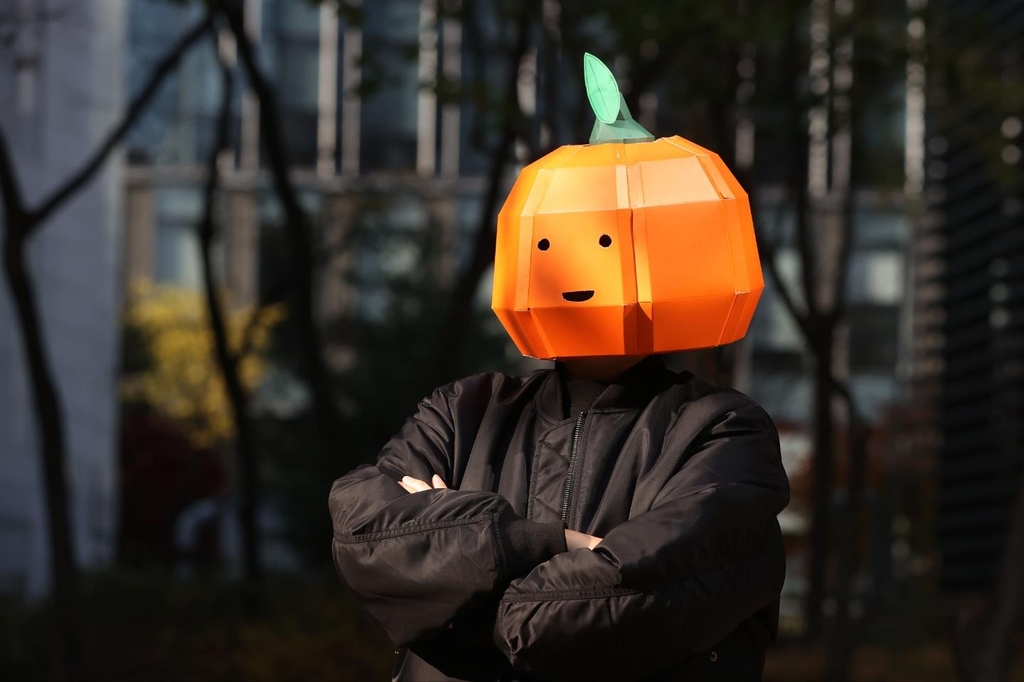 | ▲ 웹툰 '술꾼도시처녀들' 그린 미깡 작가 (서울=연합뉴스) 강민지 기자 = 웹툰 '술꾼도시처녀들'을 그린 미깡 작가가 24일 서울 종로구 연합뉴스 인터뷰에 앞서 귤 모양 탈을 쓰고 포즈를 취하고 있다. 귤 모양 탈은 필명인 미깡(귤의 일본식 표현)을 형상화한 것이다. mjkang@yna.co.kr |
