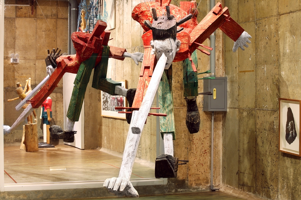 수직으로 세운 피아노 위에 첼로와 콘트라베이스가 거꾸로 매달려 있다. 그 옆에 푹신한 가죽 소파처럼 보이는 의자는 사실 딱딱한 쇳덩어리다.