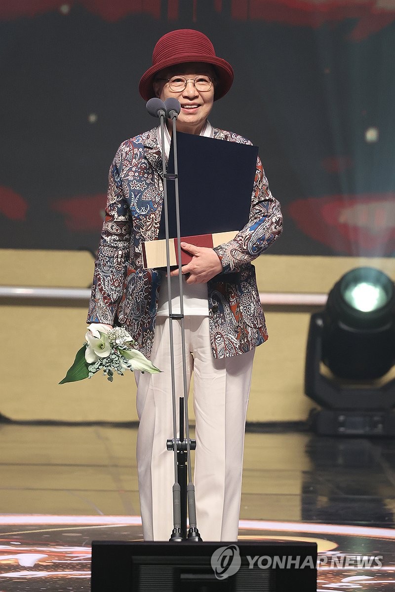 | ▲ 보관문화훈장 수상자 양인자 (서울=연합뉴스) 강민지 기자 = 양인자 작곡가가 10월 21일 오후 서울 중구 국립극장 해오름극장에서 열린 '2023 대한민국 대중문화예술상' 시상식에서 '보관문화훈장'을 수상 소감을 말하고 있다. 2023.10.21 mjkang@yna.co.kr |