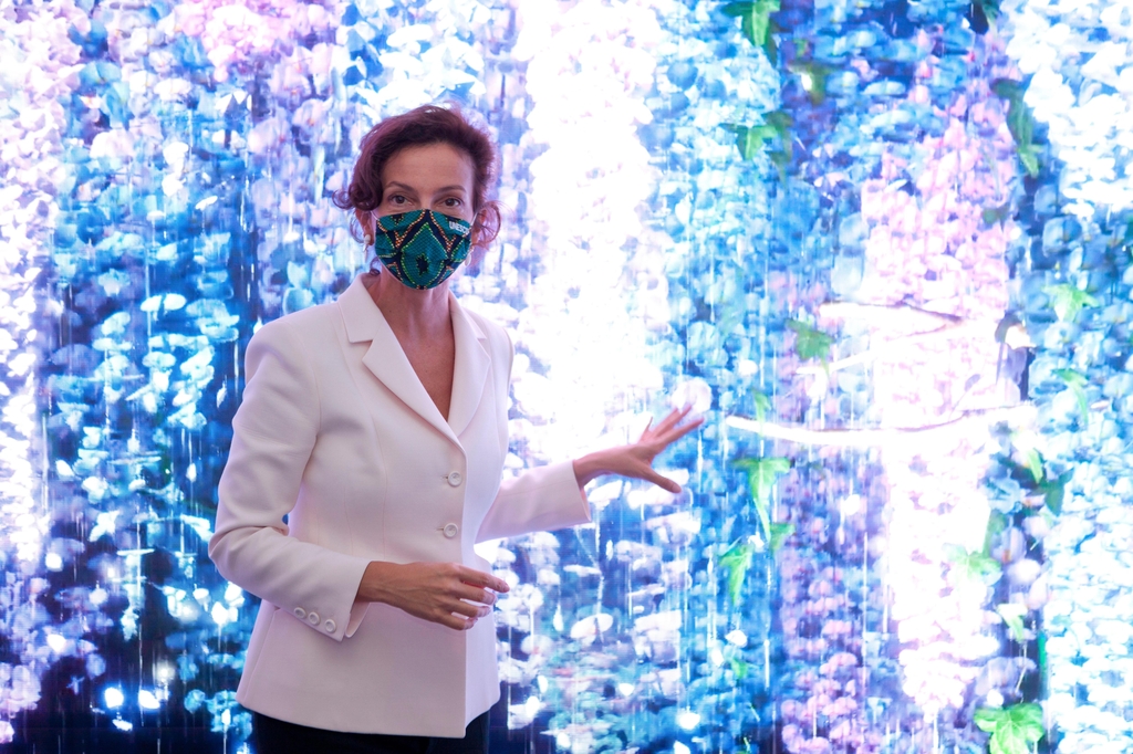 | ▲ 오드레 아줄레 유네스코 사무총장 (파리=연합뉴스) 현혜란 특파원 = 오드레 아줄레 유네스코(UNESCO) 사무총장이 13일(현지시간) 오후 파리 유네스코 본부에 마련된 '한국: 입체적 상상' 전시회장에서 디스트릭트의 '플라워'(Flower)를 관람하고 있다. 2021.7.13 [주프랑스 한국문화원 제공. DB 및 재판매 금지] |