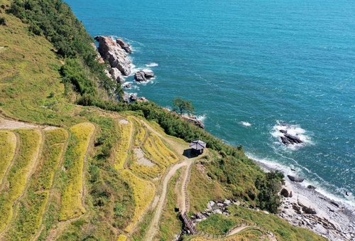 섬이정원을 나와 오랜만에 다랑논 지역으로 유명한 남면 홍현리의 다랭이마을을 들렀다. 연푸른 남해의 아름다운 해안을 배경으로 가을 벼들이 다랑논에서 노랗게 익어가고 있었다.