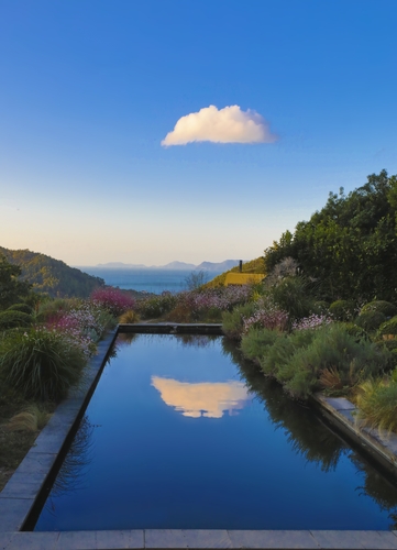 이곳에서 한참을 돌아 언덕을 올라가니 탁 트인 전망이 나타났다. 마치 수영장 같은 형태의 직사각형 연못 뒤쪽으로 짙푸른 남해가 펼쳐져 있고, 연못 주위에는 핑크뮬리와 프렌치 라벤더 등 다양한 허브와 꽃들이 자리 잡고 있었다.