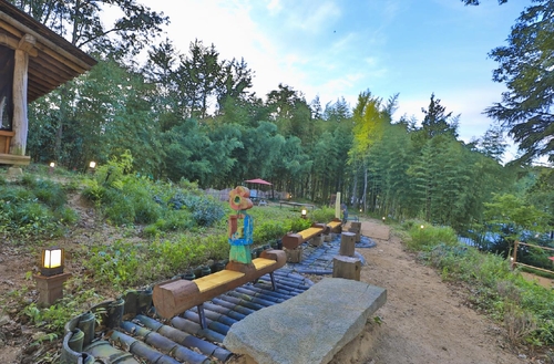 제일 위에는 작은 원두막이 있고, 그 밑에 쉬어갈 수 있는 작은 벤치 등이 다채롭게 꾸며져 있다. 벤치 바닥에는 수백 년 된 고택에서 뜯어온 기와가 깔려 있다.