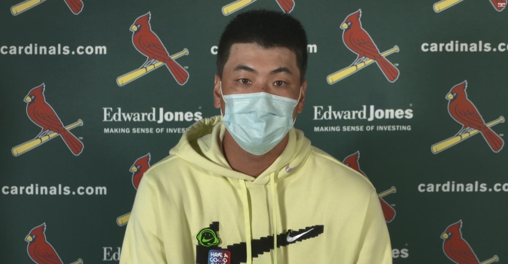 | ▲ 9일 시범경기 후 화상 인터뷰하는 김광현 [세인트루이스 카디널스 프레스박스 화상 인터뷰 캡처. 재판매 및 DB금지] |